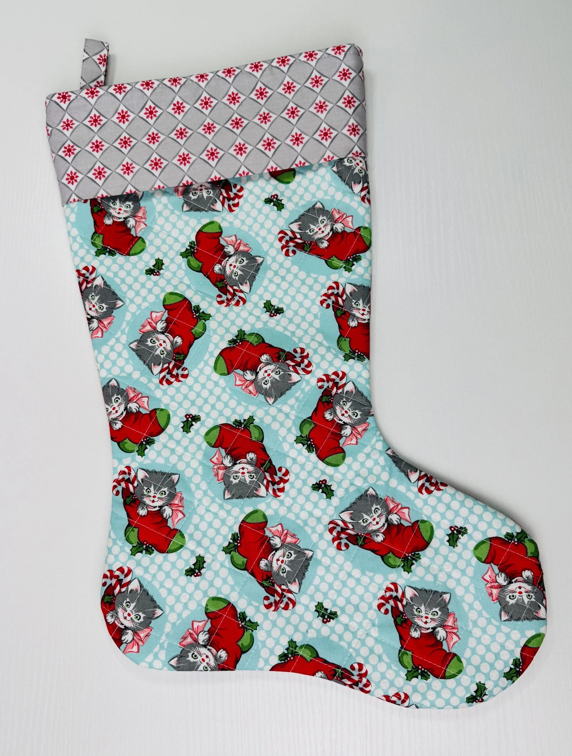 Super cute blue kitty cat stocking with a gray and red checkered snowflake print for the cuff and inside fabric. Stocking measures at 18 inches tall and approximately 9 inches wide at the top.