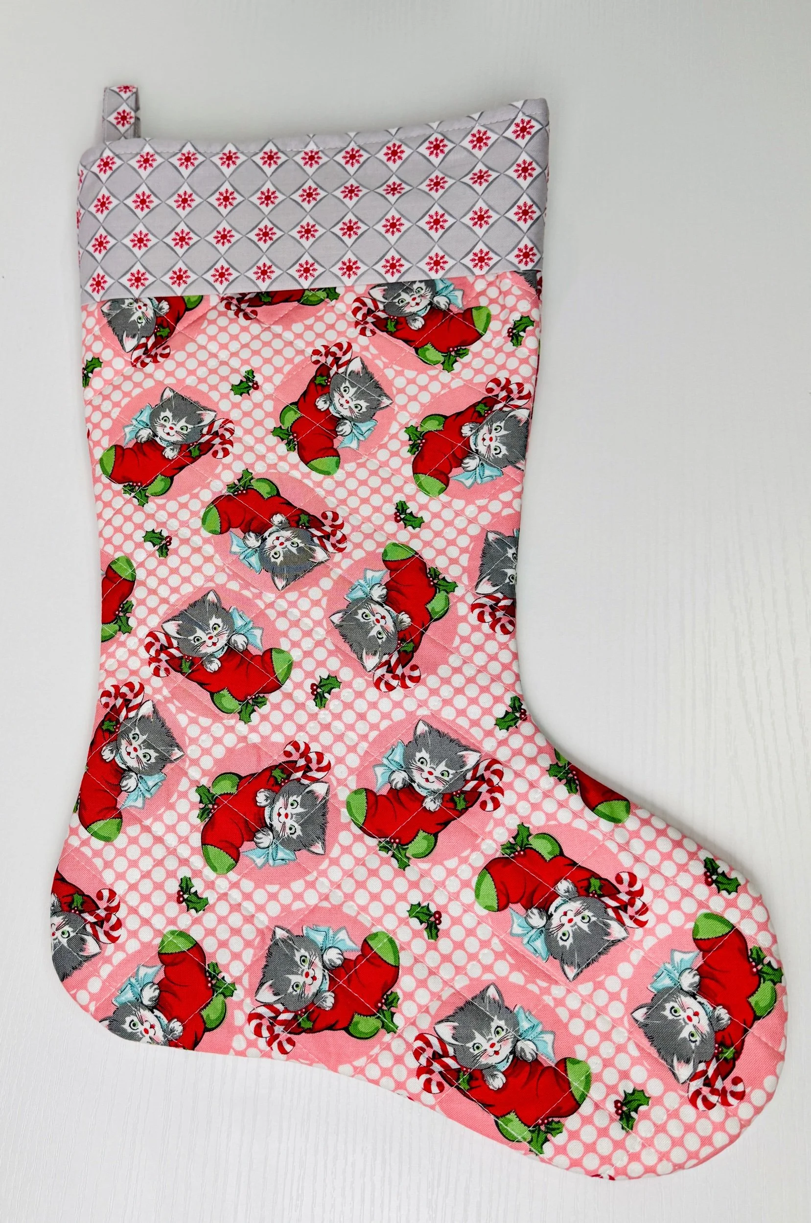 Super cute pink, kitty cat stocking with a gray and red and white checkered cuff and inside fabric with snowflakes on it. This stocking measures at 18 inches tall and about 9 inches wide at the top opening.