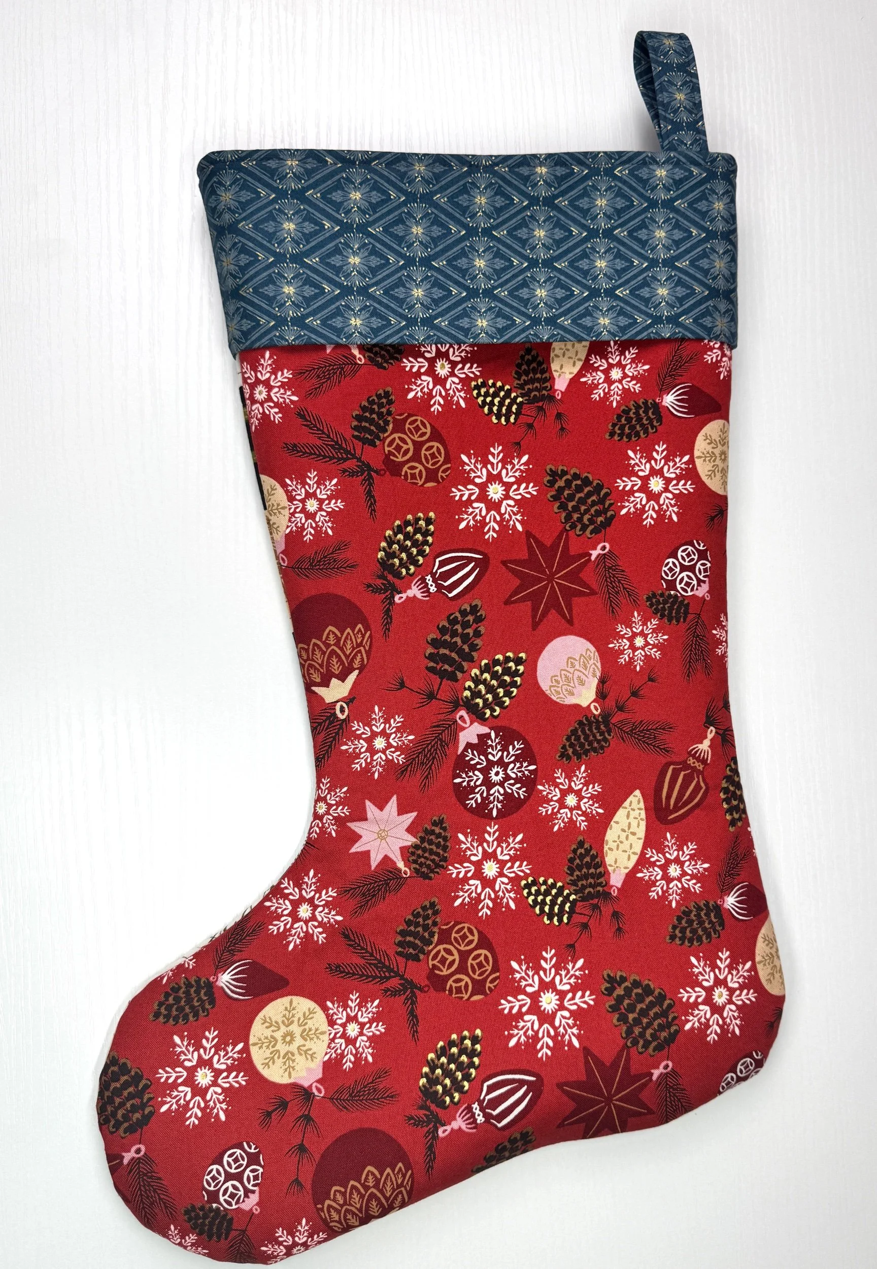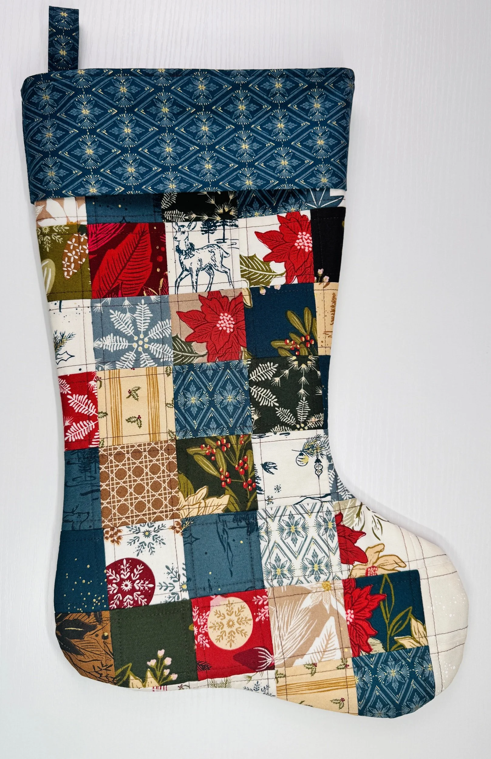 With blues, reds, Greens and tan this Classic Christmas stocking has a beautiful blue cuff to bring it all together!