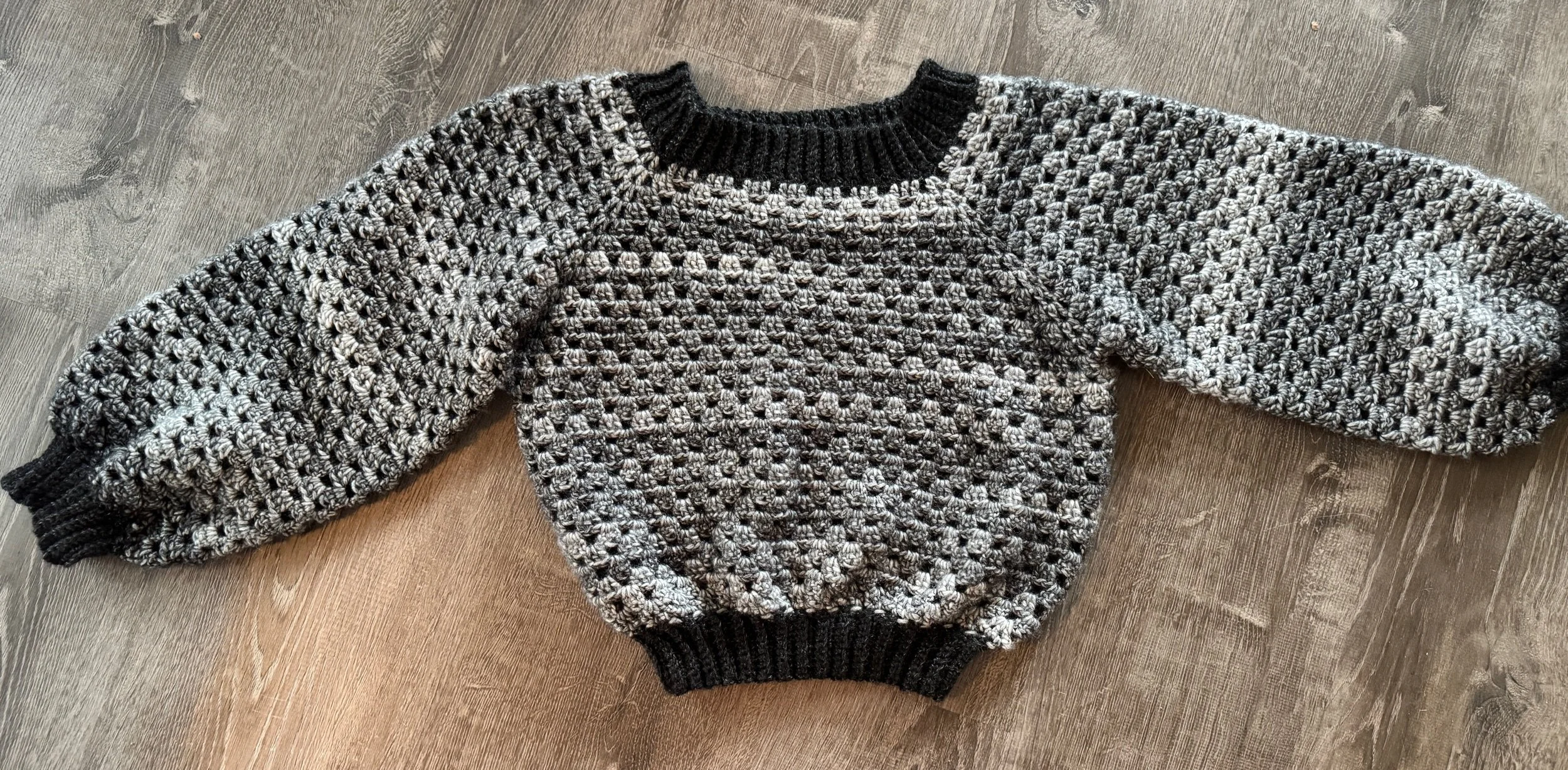Deep charcoal ribbing at the neckline, cuffs, and hem adds contrast and structure, giving the sweater a classic finished look and helping it hold its shape. The long sleeves are roomy and warm, perfect for layering on cooler days. Every stitch is carefully handcrafted, making this sweater truly one of a kind.